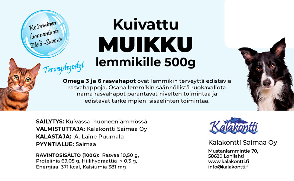 Kuivattuja muikkuja lemmikkieläimille. Kotimainen luonnontuote Etelä-Savosta. Kuivattu muikku on lisäaineeton ja terveellinen herkku lemmikeille.
